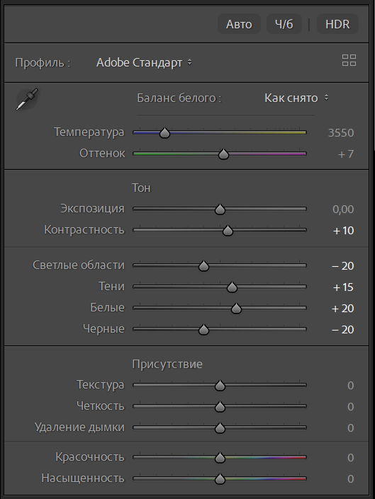 Данные настройки применяю, правлю только ползунок ЭКСПОЗИЦИЯ затемняя или осветляю кадр.